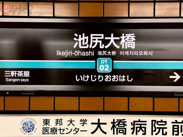 池尻大橋駅の駅名標。下の看板にある病院名に、由来となった地名が見て取れる(乗りものニュース編集部撮影)。
