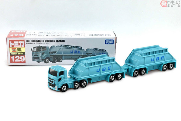 宇部興産は2020年7月28日(火)、同社のセメント工場で使われる大型のダブルストレーラーが、タカラトミーのミニカー「トミカ」として9月19日(土)に発売されると発表しました。