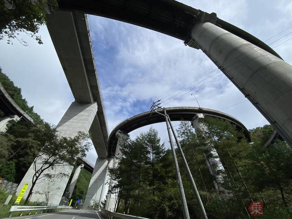 やがて矢筈ダムを過ぎたところで視界に入ったのは、天まで登るような円柱形の橋脚群と、絡みつくように何本も曲がりくねる高架橋でした。まさに「天空のIC」といった雰囲気、これが喬木ICです。