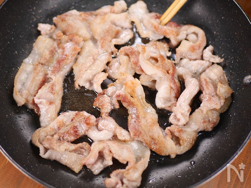 (2) フライパンにサラダ油(大さじ1、分量外)と豚肉を綺麗に並べ、強めの中火で片面を焼き色を付けて8割ほど焼き、裏返しフタをして弱火で2~3分蒸し焼きにする。