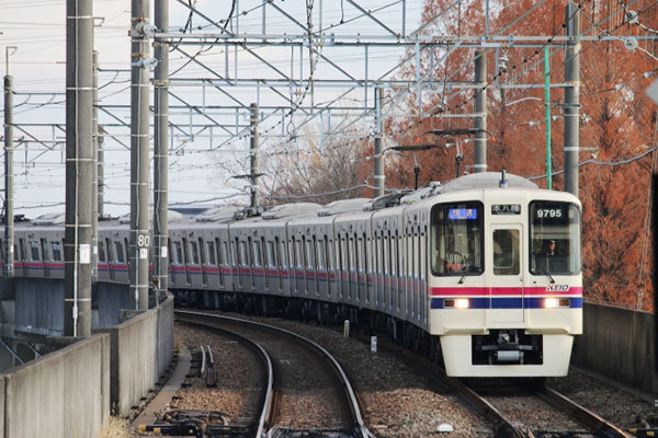 橋本駅に入る京王の電車。地上のJR線を乗り越してカーブ、JR線と並行する形で高架駅が設けられている(画像:写真AC)。