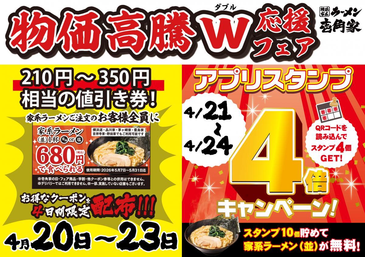 横浜家系ラーメンの壱角家では、2026年4月20日から24日までの期間限定で「壱角家 物価高騰ダブル応援フェア」を開催中です。