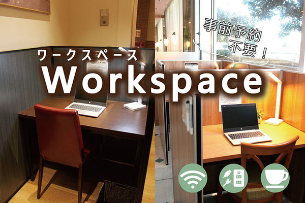 ただ、それらしき場所が見当たらず、もう一度看板を見ると、「レストランにお声がけを」とあります。しかしレストランはいたって普通の店構え。あのぉ……と店員に声をかけると、「ワークスペースですね」と店内に通されました。あたりを見渡すと、確かに、一画にパーテーションで囲まれたスペースが。